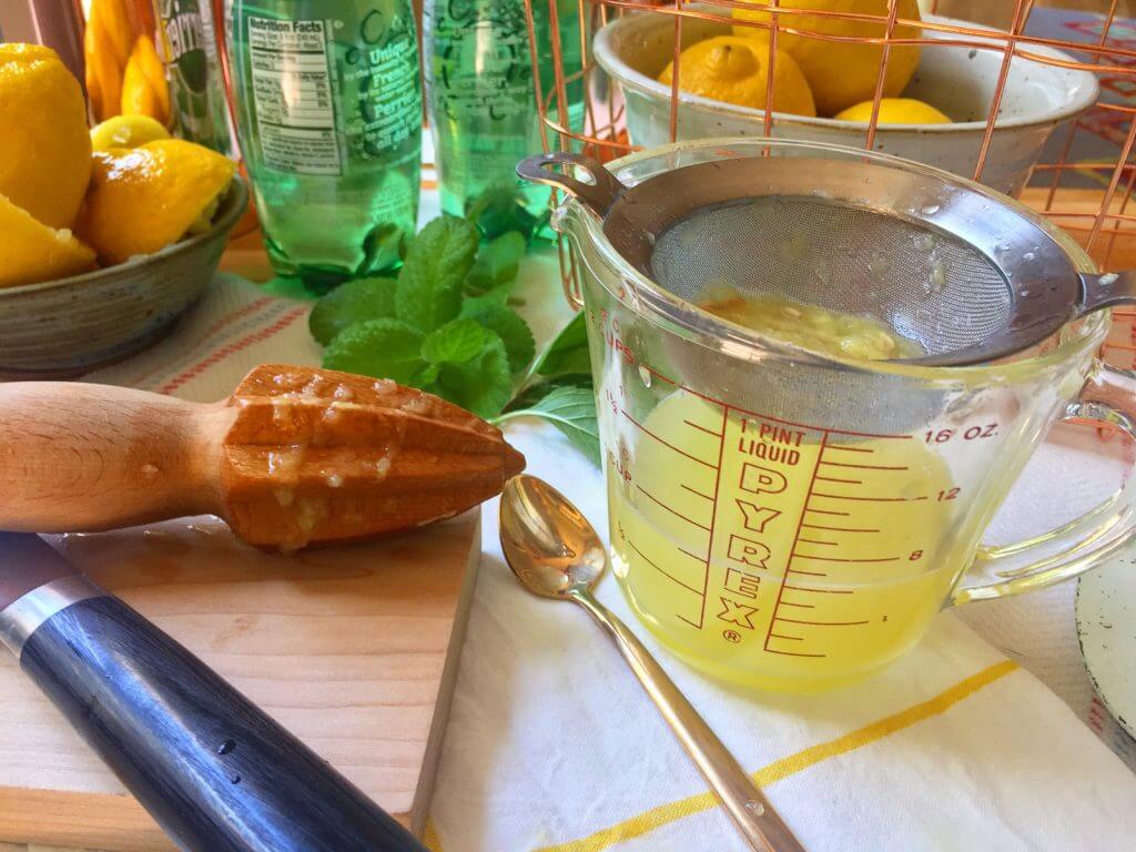 While juicing the lemons, be sure to strain out pulp and seeds. For this recipe, I used ¾ c freshly squeezed lemon juice. Once you are finished juicing the lemons, place the juice in the fridge to chill.