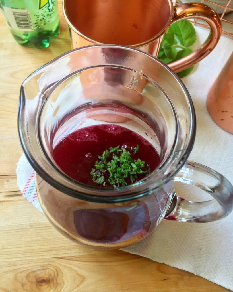 Combine the blackberry simple syrup and freshly squeezed lemon juice. Top with 1 tablespoon of finely chopped fresh mint.